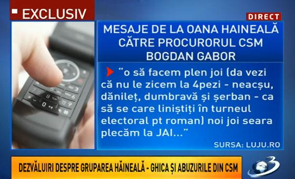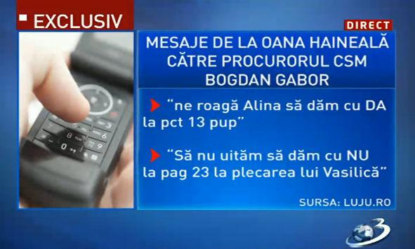 Mai multe SMS-uri pe care președinta CSM Oana Schmidt Hăineală le-a trimis în vara anului trecut (pe când era doar vicepreședintă) procurorului Bogdan Gabor, membru al Consiliului, au fost date duminică publicității de siteul „Lumea Justiției” (luju.ro). Potrivit siteului respectiv, cel care este la originea dezvăluirii SMS-urilor lui Hăineală este un fost șofer din cadrul CSM, Angel Gabriel Roșca, acesta găsindu-le în telefonul de serviciu, care aparținuse anterior procurorului Gabor. „La data de 18 iulie 2012, Angel Gabriel Roșca a primit pe inventar de la DEA din cadrul CSM un telefon Nokia 2730, cu numarul 0724.127.366, care a aparținut anterior, pentru scurtă durată, procurorului Bogdan Gabor din CSM (…) Fără să vrea, folosind telefonul ce i-a fost dat în custodie, șoferul a depistat în memoria acestuia o serie de mesaje tip SMS purtate de fostul deținător cu Oana Hăineală, Alina Ghica și Monica Prejmereanu (purtător de cuvânt al CSM – fost ofițer DGIPI), personaje care de anul trecut fac toate jocurile în CSM”, scrie „Lumea Justiției”. Sursa citată afirmă că în SMS-urile respective, Oana Hăineală nu se sfia să folosească, referindu-se la colegii din CSM, calificative precum „dobitoc”, „nesimțit”, „cretin”, „porc”, „idioți” și „4pezi”. De asemenea, în mesajele evocate de luju.ro apar solicitări din partea Oanei Hăineală (unele făcute în numele Alinei Ghica, președintă a CSM la acea dată) pentru ca procurorul Gabor – căruia îi erau adresate SMS-urile – să voteze într-un anume fel diverse puncte de pe ordinea de zi. În opinia siteului „Lumea Justiției” aceste îndemnuri pot reprezenta chiar o încălcare a legii care prevede că votul în CSM drept să fie „direct și secret”. „În opinia noastră, faptele dezvăluite de fostul angajat al CSM pot friza infracțiunea de trafic de influență, dată de art. 257 Cod penal, precum și de Legea 78/2000 privind prevenirea, descoperirea și sanctionarea faptelor de corupție. Aceasta întrucât membrii aleși ai CSM sunt mandatați de magistrații care i-au ales, să voteze nu după cum dorește cineva anume, ci cum le dictează conștiința și interesul magistraților pe care îi reprezintă în Consiliu”, notează luju.ro, care precizează că articolul publicat poate fi considerat și sesizare oficială către DNA. Iată conținutul a patru din SMS-urile trimise de Oana Schmidt Hăineală procurorului Gabor și care au fost găsite în telefon de fostul șofer de la CSM: