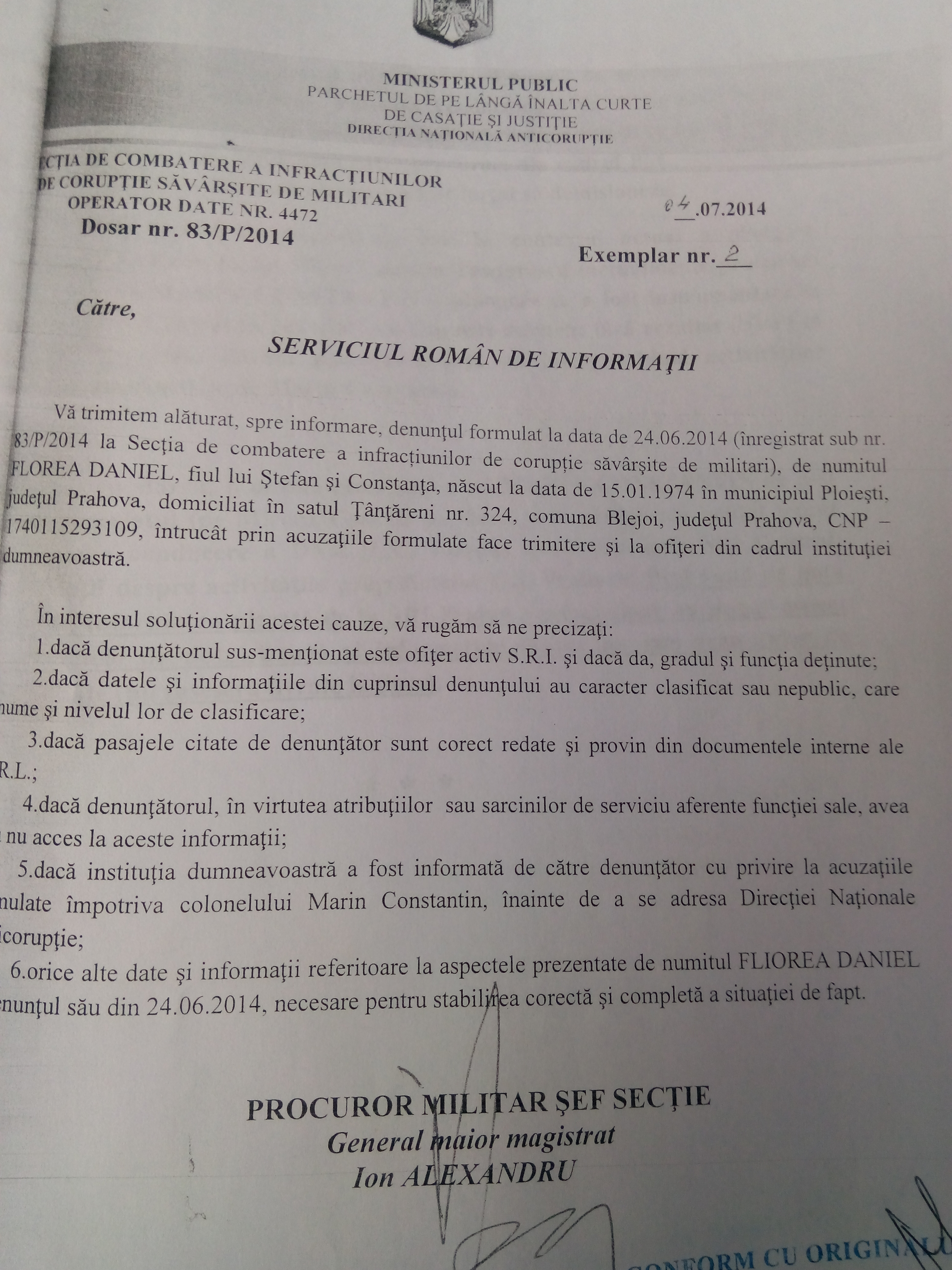 AICI – Răspunsul-avertisment al SRI către mr. (r) Daniel Florea, care-l averizează să stea cuminte, dacă nu vrea s-o încurce.